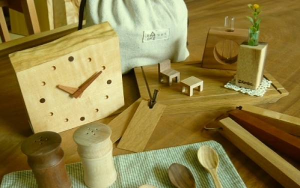 テーブルのほか、無垢材をふんだんに使ったテレビ台や食器棚、木の時計などの雑貨 も多数展示しています