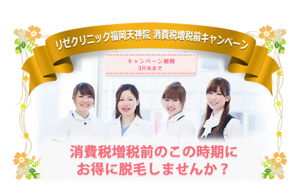 消費税増税前に、お得に医療レーザー脱毛しませんか? 美容皮膚科リゼクリニック福岡天神院では、只今キャンペーンを実施中です! この機会に是非ご利用ください。